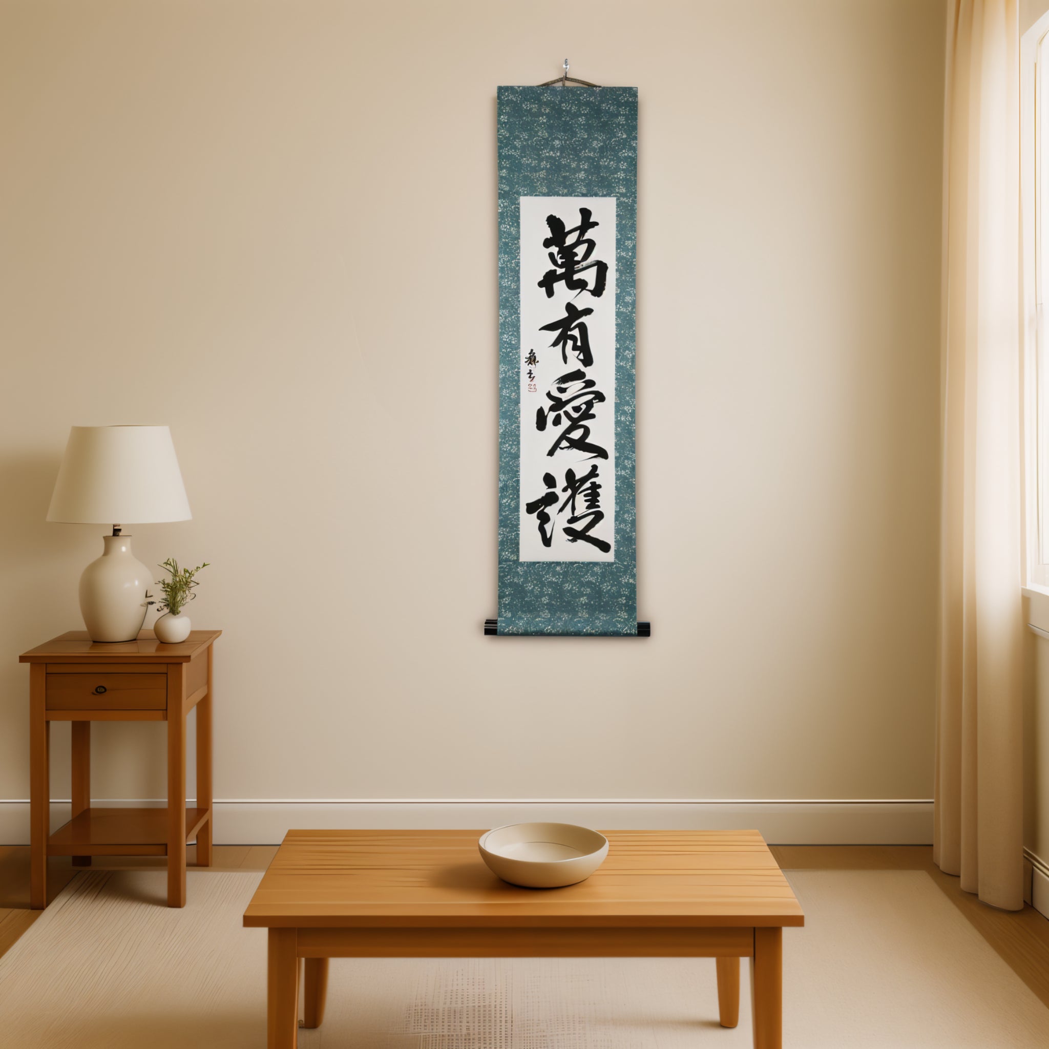 This Japanese calligraphy scroll features the powerful phrase 萬有愛護 (Banyū Aigo), meaning “Universal Love and Protection”.
