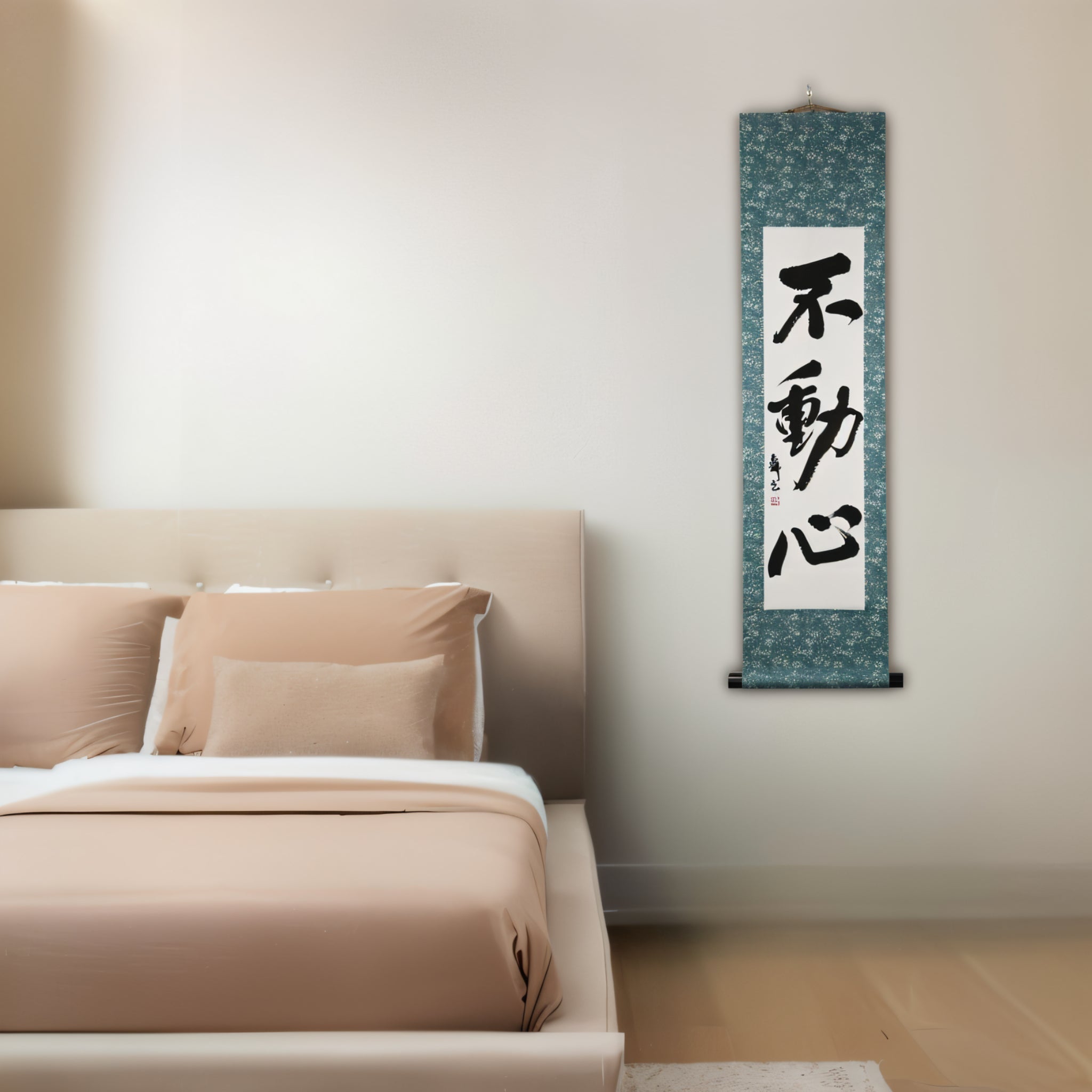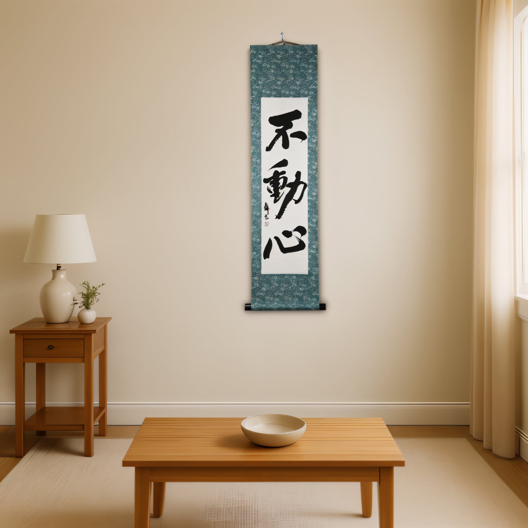 This calligraphy scroll features the profound concept of 不動心 (Fudōshin) — "the immovable mind". It represents a calm, centered state of being that remains unshaken by fear, anger, or doubt. In martial arts and the way of the Samurai, Fudōshin is considered essential to true mastery.