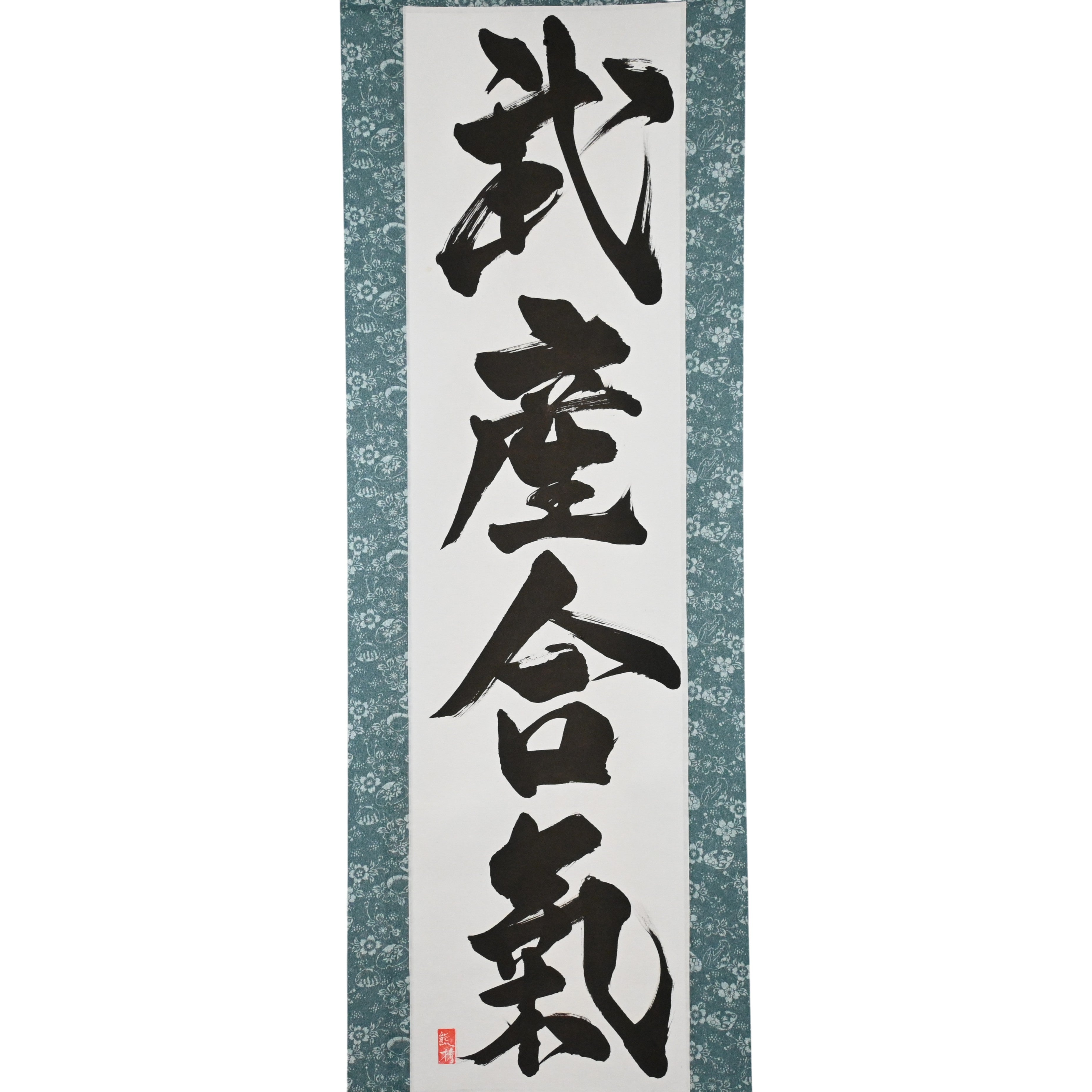 Diese japanische Kalligraphie-Rolle zeigt den tief spirituellen Ausdruck 武産合気 (Takemusu Aiki) — „Die kämpferische Geburt der Harmonie“. Ein Kernbegriff des Gründers des Aikido, Morihei Ueshiba (植芝盛平), der die höchste Verwirklichung der Kunst zusammenfasst.
