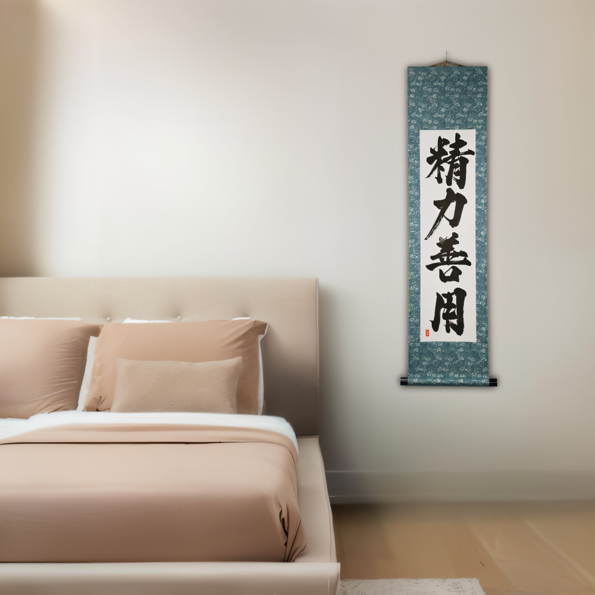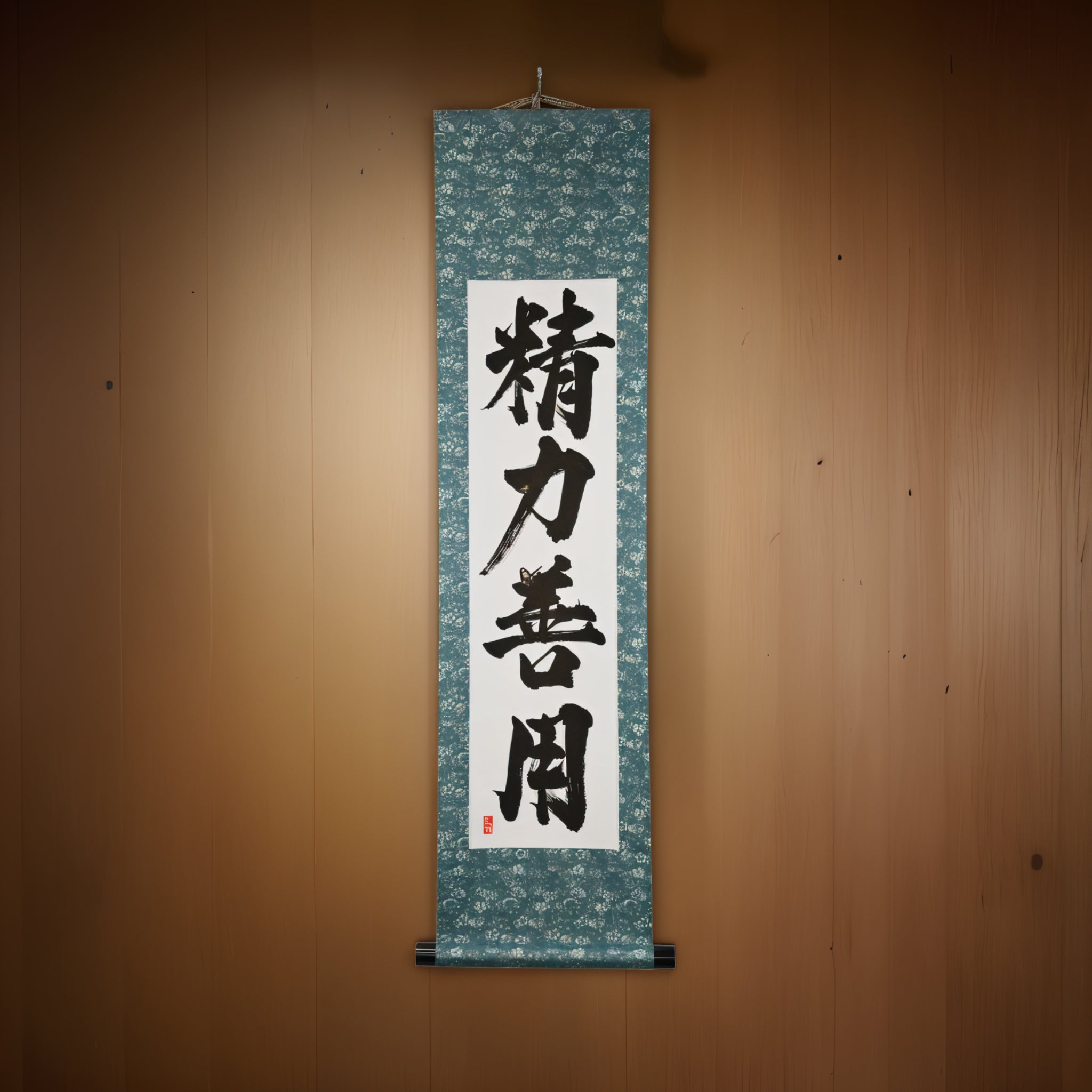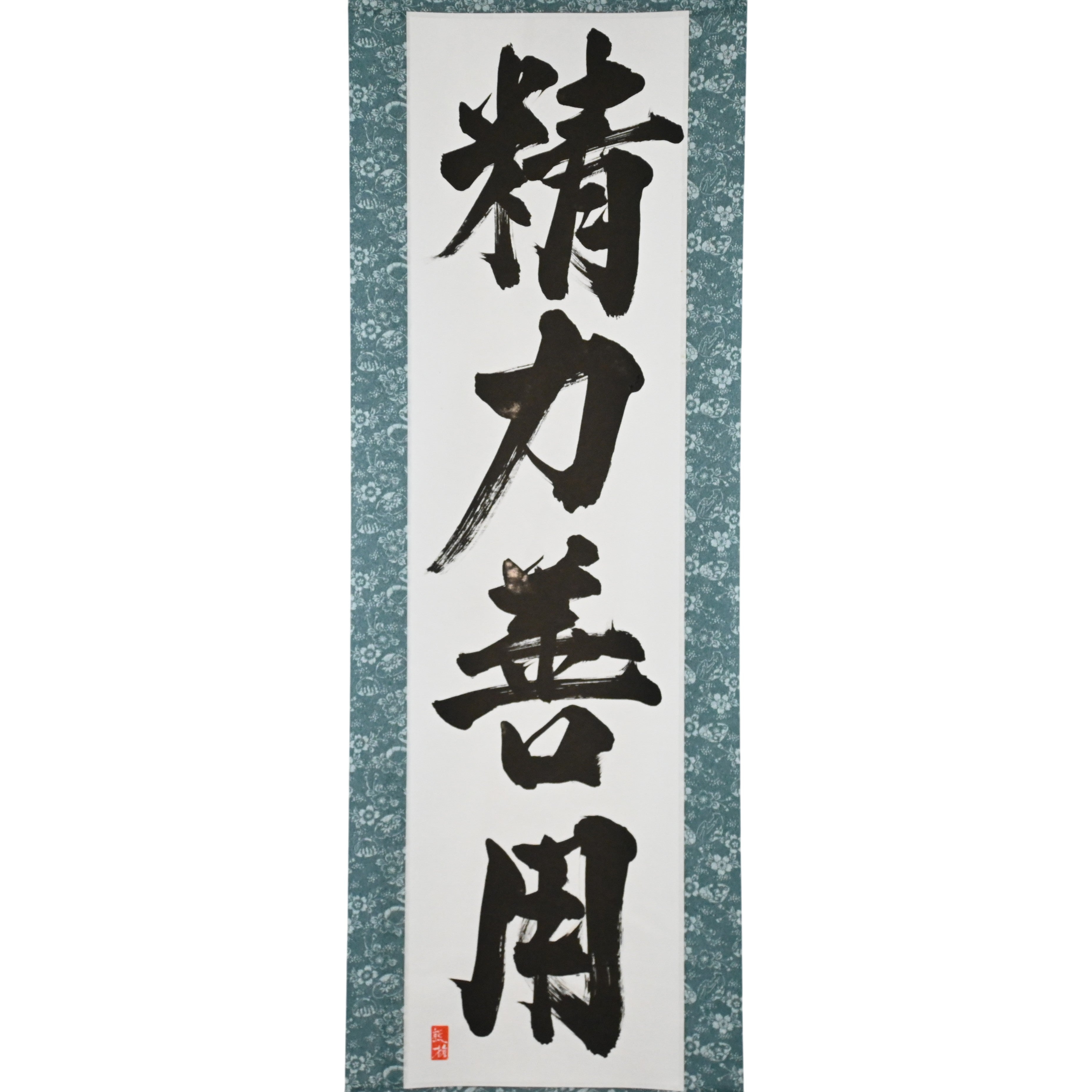 Diese japanische Kalligraphie-Rolle zeigt den zeitlosen Ausdruck 精力善用 (Seiryoku-Zenyō) — übersetzt als „Maximale effiziente Nutzung der Energie“. Es ist eines der beiden Kernprinzipien des Judo, neben 自他共栄 (Jita-Kyōei, „Gegenseitiges Wohlergehen und Nutzen“), beide von Judos Gründer Jigoro Kano (嘉納治五郎) festgelegt.